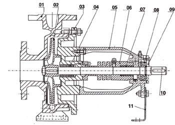RY熱油泵的結(jié)構(gòu)大致分為兩種:一種是中心支撐結(jié)構(gòu),另一種是腳支撐結(jié)構(gòu)。且熱油泵泵體的進口與出口方向不在一條水平線上,進口為軸向吸入,出口為中心垂直向上。熱油泵整機共分為三部分:泵頭,底座,電機。泵頭與電機用彈性聯(lián)軸器相連接,并一同固定在底座上。